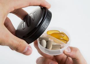 La bandeja para píldoras se acopla en cualquier tapa de los frascos, lo que le permite transportar píldoras y polvos.